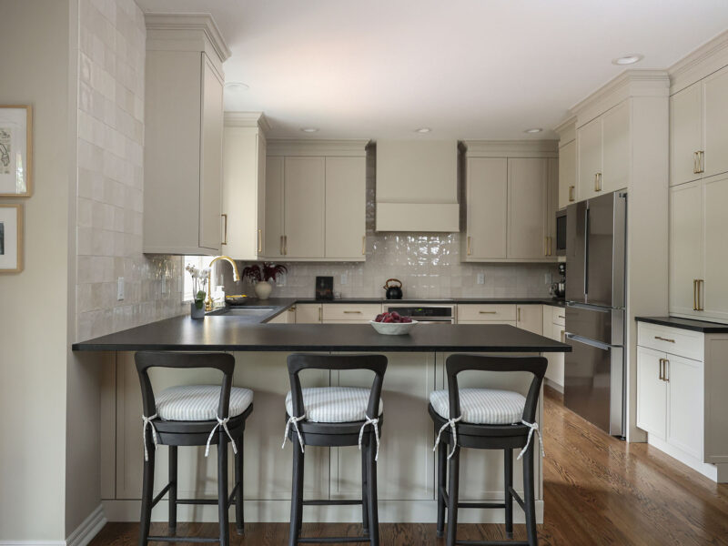 Elegant greige kitchen remodel featuring warm cabinetry, sleek black countertops, and peninsula seating—blending timeless design with modern functionality.