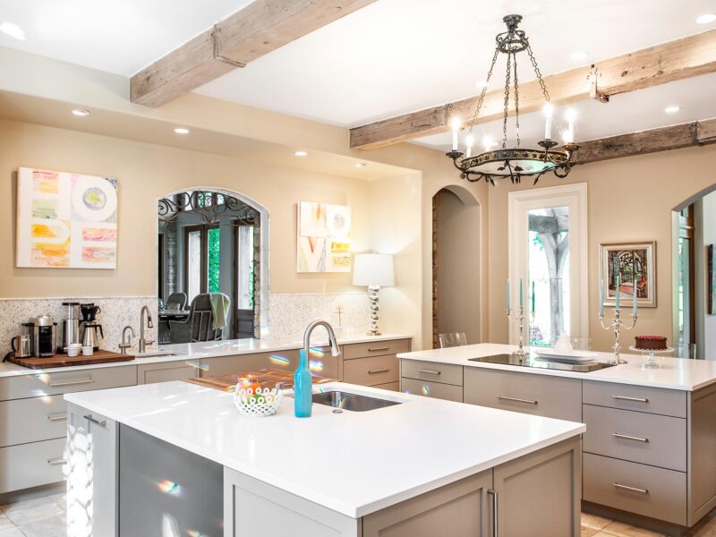 Comfy Tulsa kitchen remodel blending modern design with rustic accents, featuring a dedicated coffee and beverage station, premium stainless steel appliances, and timeless functionality.