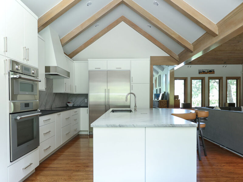 Stunning vault ceiling kitchen with custom cabinetry and a seamless open layout, creating an airy, architectural space that blends beauty and functionality.