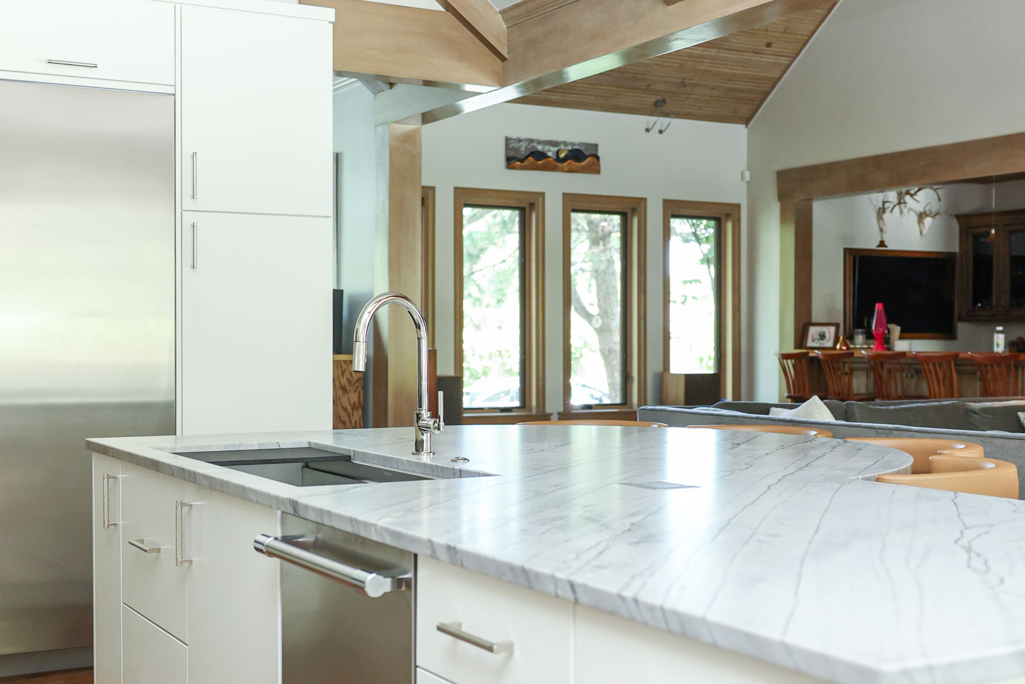 This kitchen features a thoughtfully designed open layout that promotes effortless flow between cooking, dining, and living areas. The open concept design takes full advantage of the vaulted ceilings, allowing the architectural drama to extend throughout the connected spaces. The layout creates clear sightlines across the entire area, making it easy for the cook to remain engaged with family and guests while preparing meals. This seamless integration of spaces is perfect for modern living, where the kitchen serves as the social hub of the home and entertaining flows naturally from one area to another.