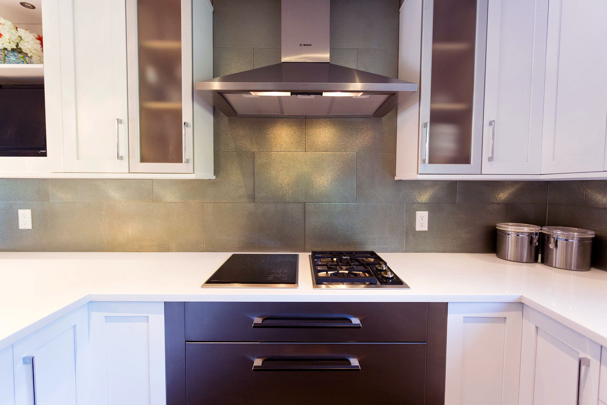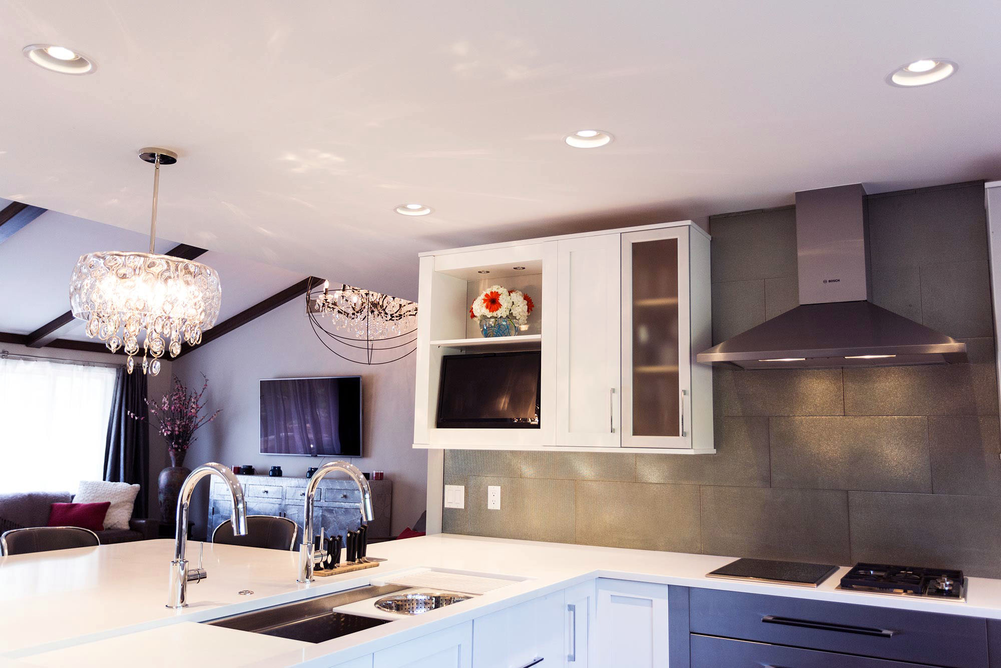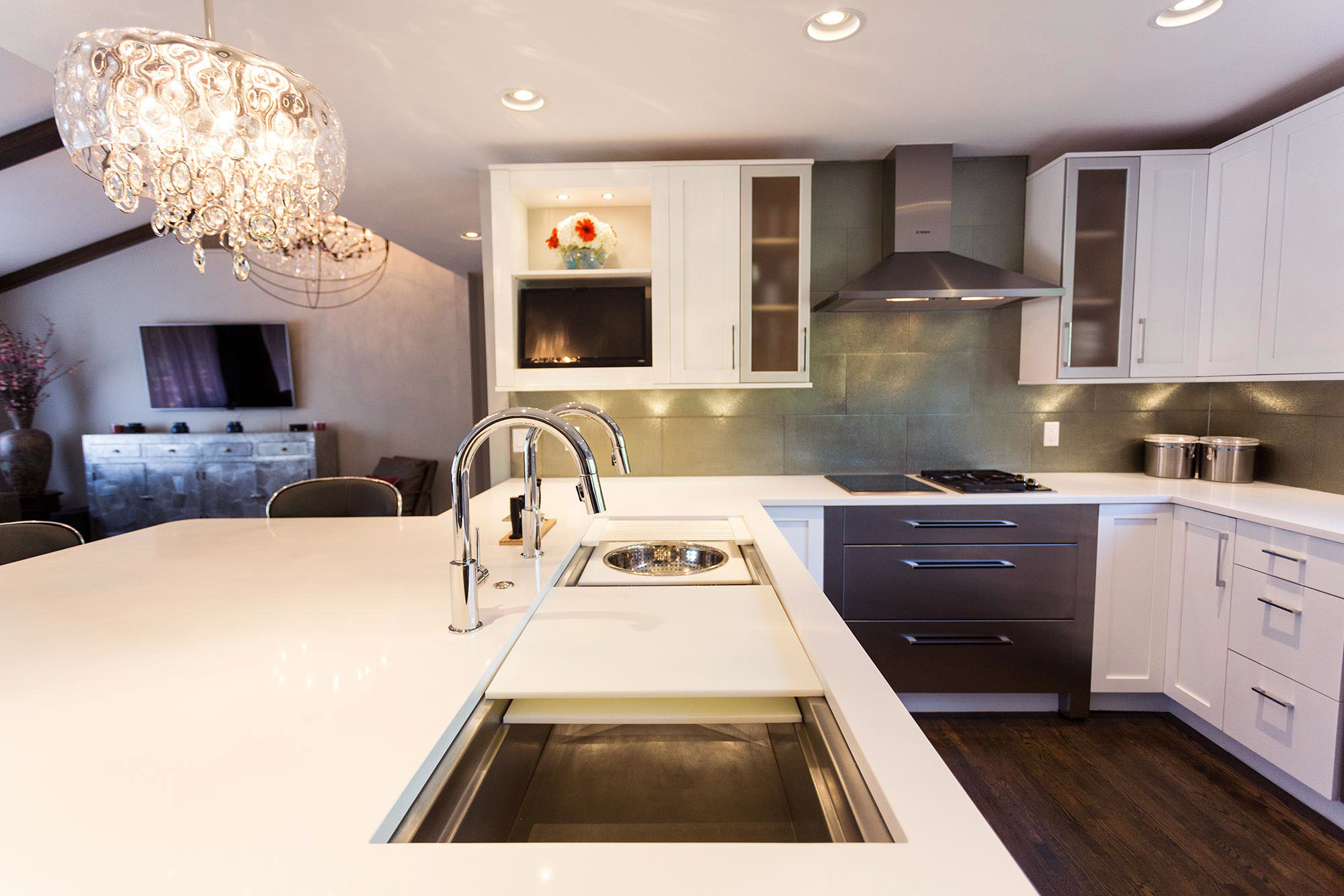 This modern Tulsa kitchen combines sleek white cabinetry, quartz countertops, and contemporary pendant lighting with functional efficiency and livable comfort. An open layout flows into the living area beneath vaulted ceilings, while a versatile peninsula with seating and the Galley Ideal Workstation streamlines meal prep. Premium Bosch appliances, including a French-door refrigerator, wall ovens, induction and gas cooktops, warming drawers, and canopy vent hood, deliver professional performance. Glass subway tile backsplash, wood flooring, extensive cabinet and pantry storage, an undermount clean-up sink, and a dedicated beverage space with frosted glass cabinets enhance organization, workflow, and entertaining, creating a modern kitchen that’s both beautiful and practical for everyday family life.
