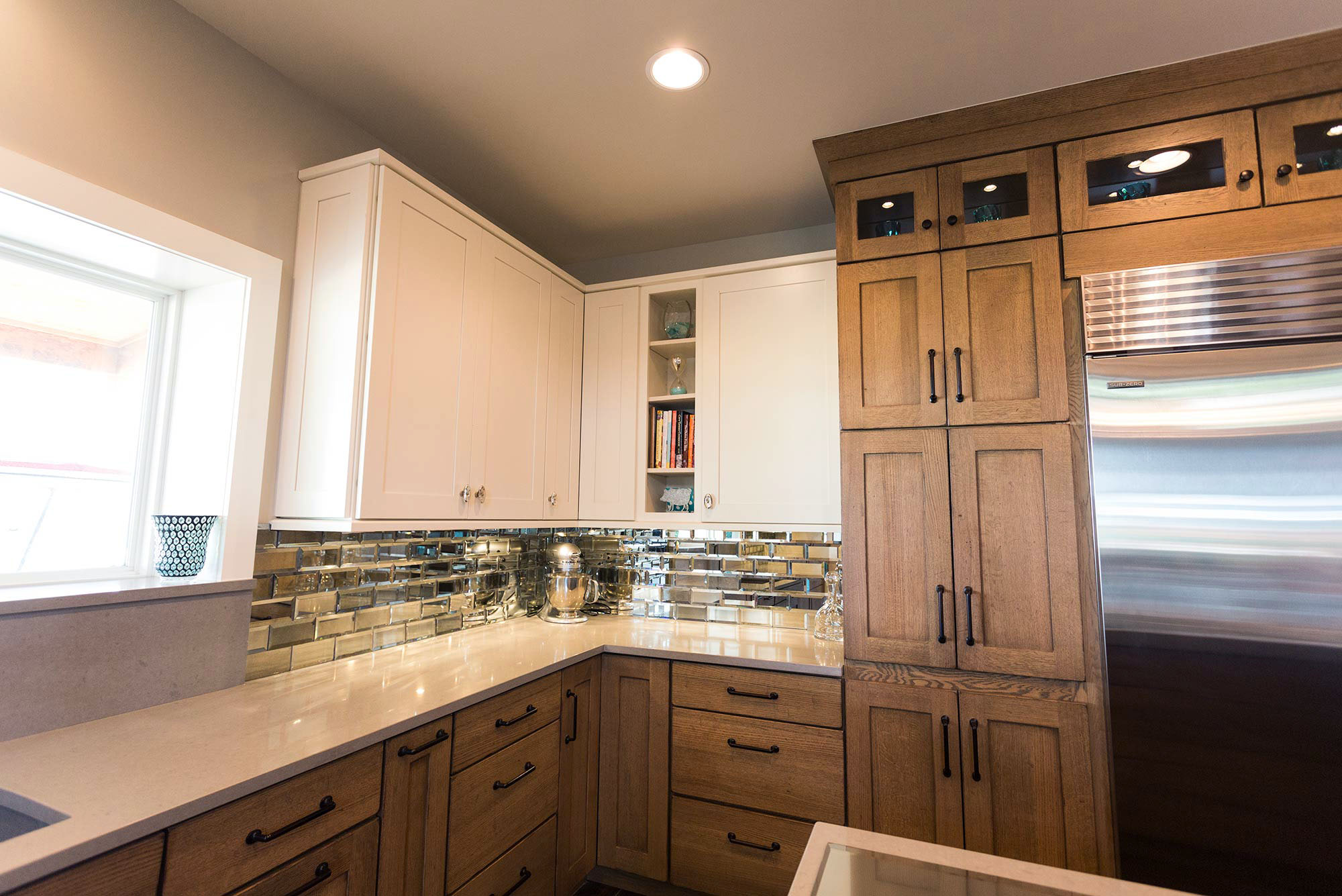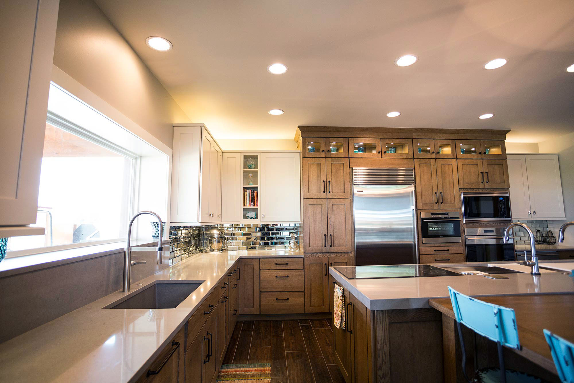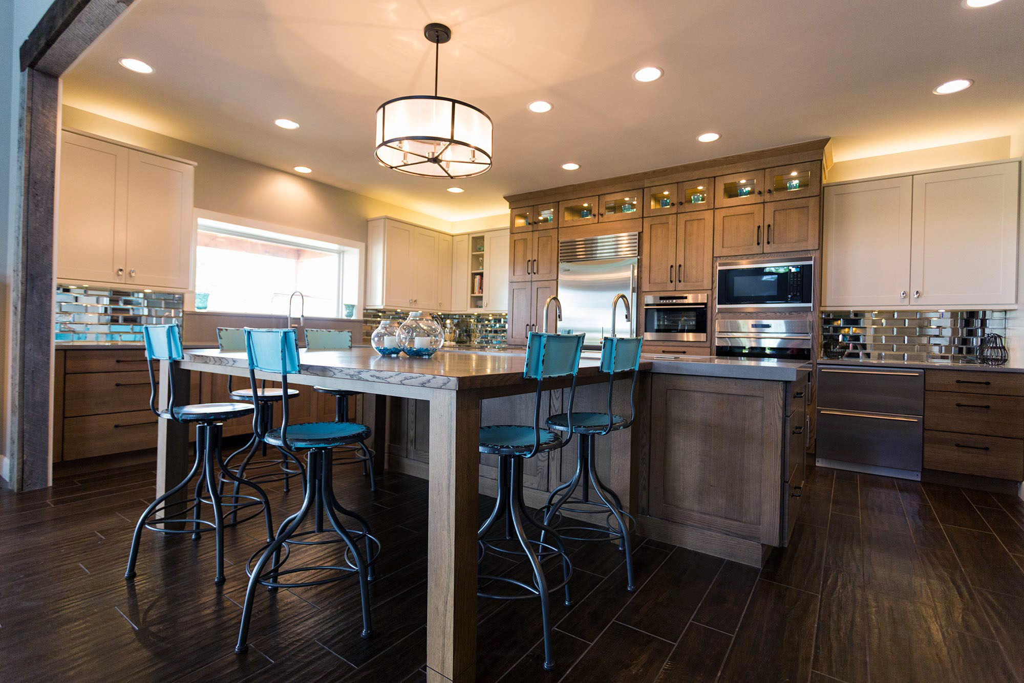 Custom Tulsa ranch kitchen design with warm wood cabinetry, quartz countertops, island seating, stainless appliances, and stylish pendant lighting.