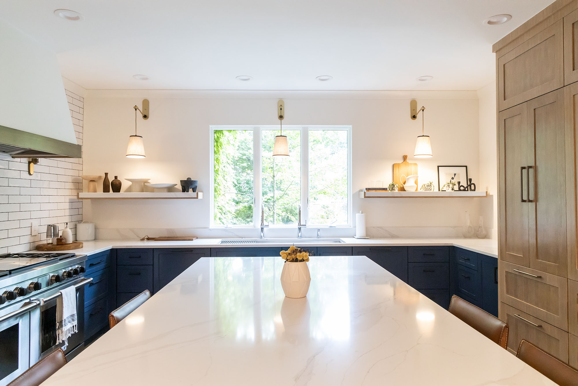 Rich blue minimalist kitchen featuring striking blue cabinets, warm wood accents, and a central island that anchors the space with modern elegance.