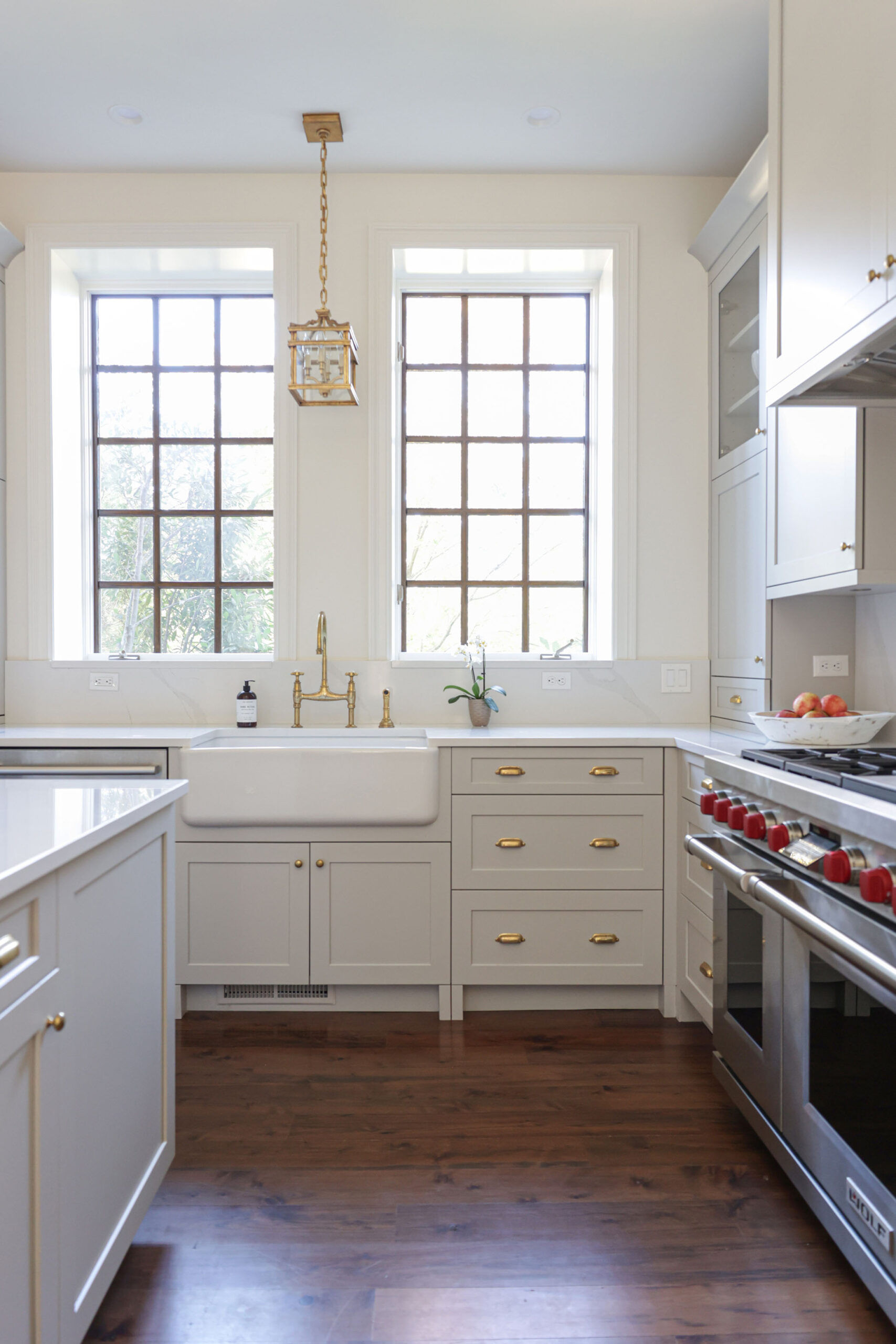 Sophisticated Tulsa kitchen remodel featuring bright white cabinetry with gold hardware, spacious island with seating and farmhouse apron sink, professional Wolf gas range with cabinet-integrated vent insert, slab countertop backsplash, designer pendant lights, drawer microwave, pullout trash, extensive drawer and door storage, dedicated beverage bar with undercounter ice maker, bar sink, glass-front cabinets, Sub-Zero professional refrigerator and freezer, crown molding, rich hardwood floors, and adjoining breakfast dining area.