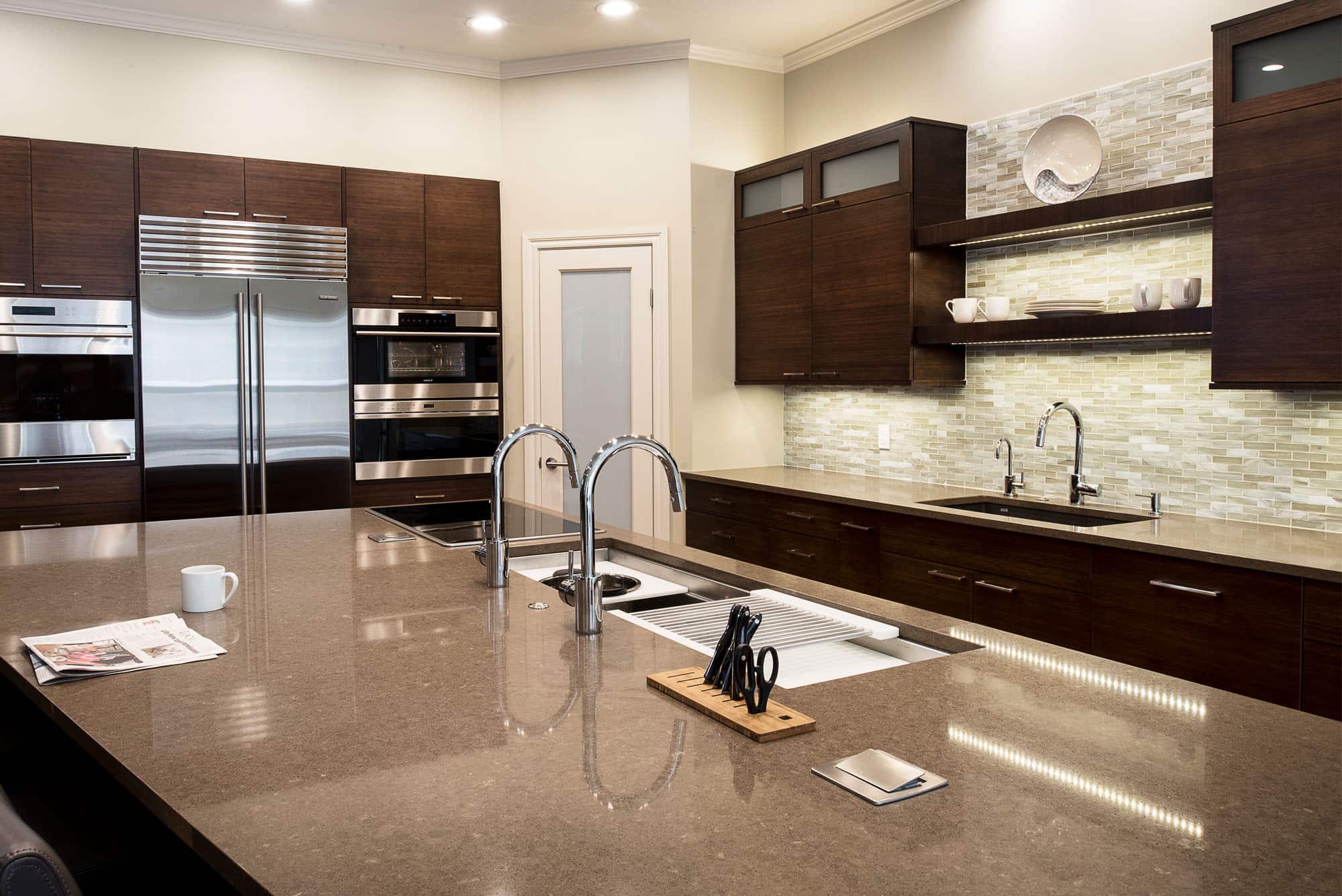 bamboo-cabinet-tulsa-kitchen-galley-ideal-workstation-wolf-induction-cooktop-quartz-counters-undermount-sink-tall-storage-wolf-steam-oven-sub-zero-french-door-refrigerator-tulsa-kitchen-remodel