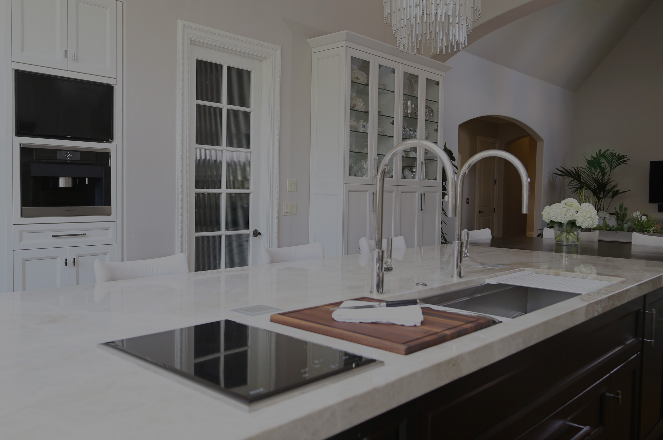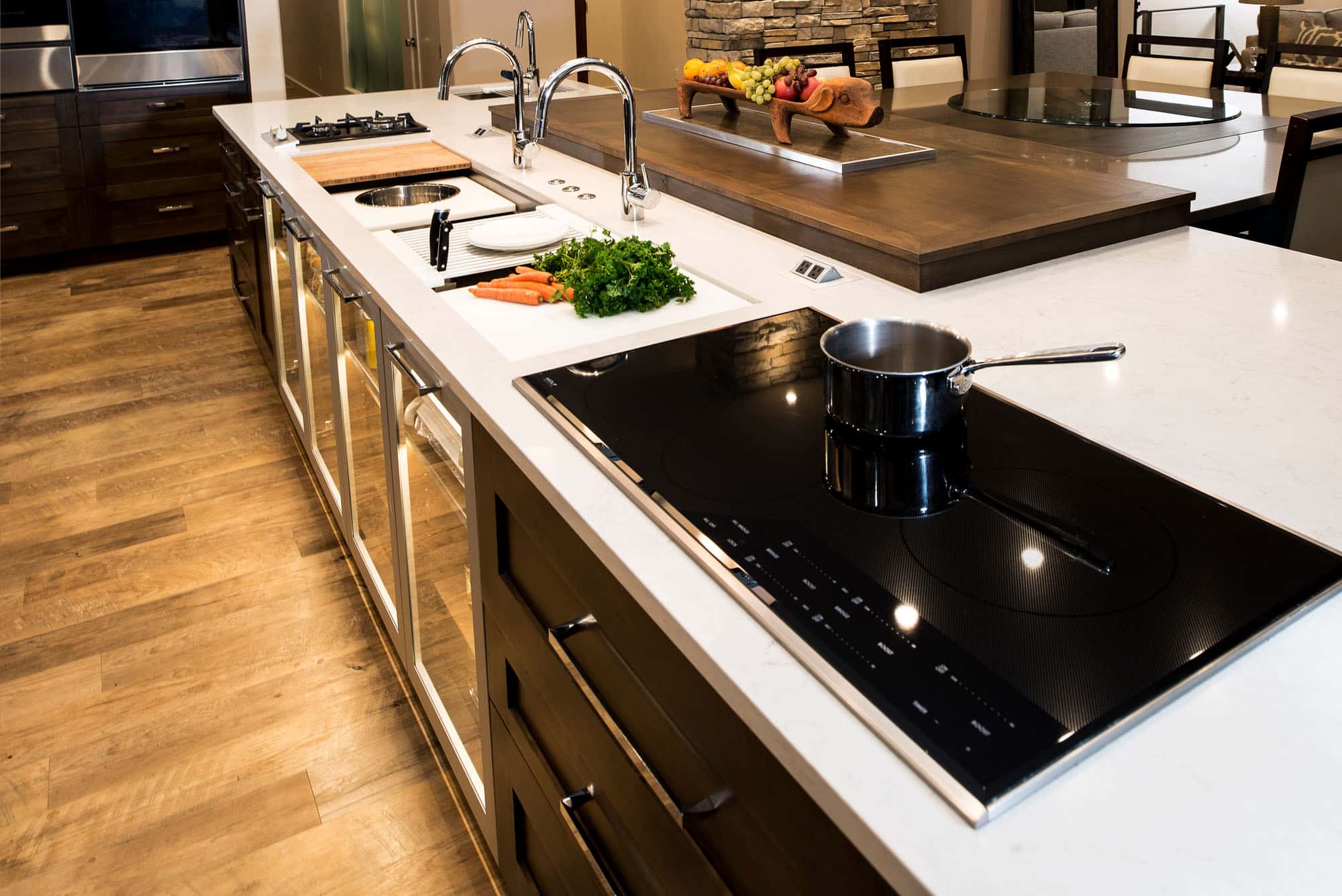 galley-ideal-workstation-wolf-gas-induction-cooktop-large-island-storage-caesarstone-counter-top-pop-up-television-luxury-vinyl-wood-flooring-tulsa-kitchen-remodel