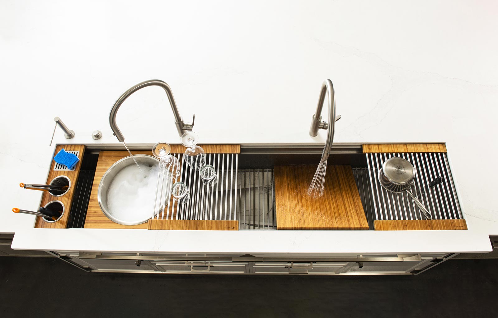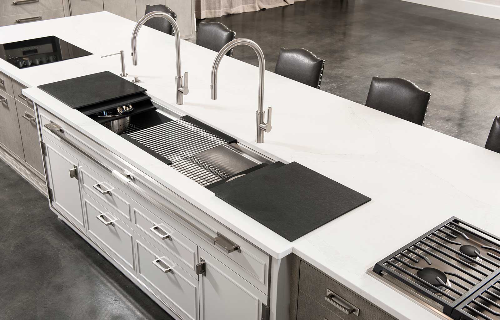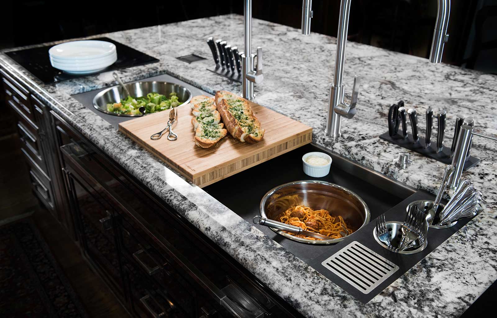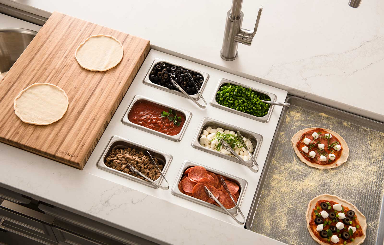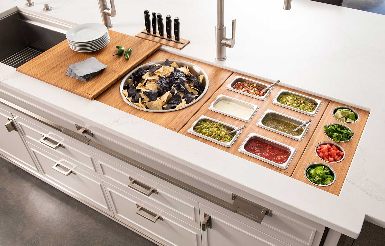 The Galley represents a whole new category of kitchen appliance, a complete culinary system where one can prepare, cook, serve, entertain, and wash all in one central and convenient place. The kitchen is even more functional and ergonomic with a cooktop next to the Workstation. This new kitchen work line concept is much more efficient than the traditional work triangle. Each Galley is thoughtfully designed, engineered, and hand-crafted in the USA.