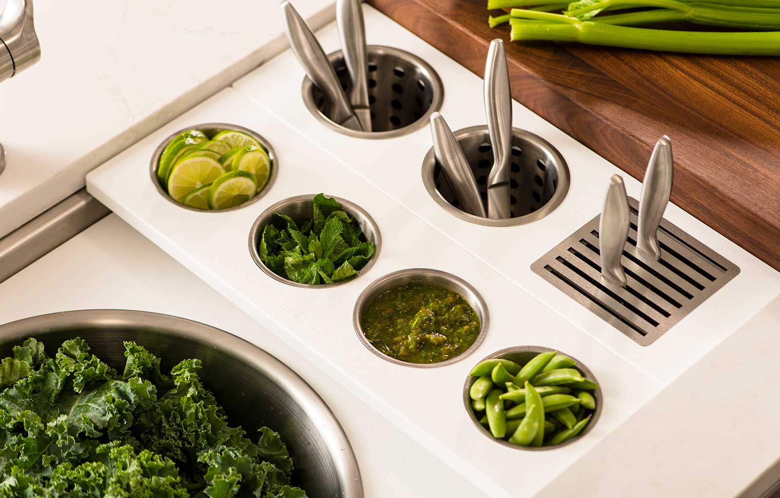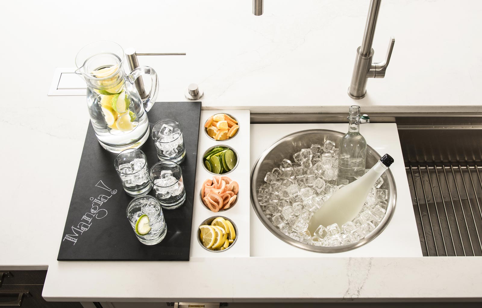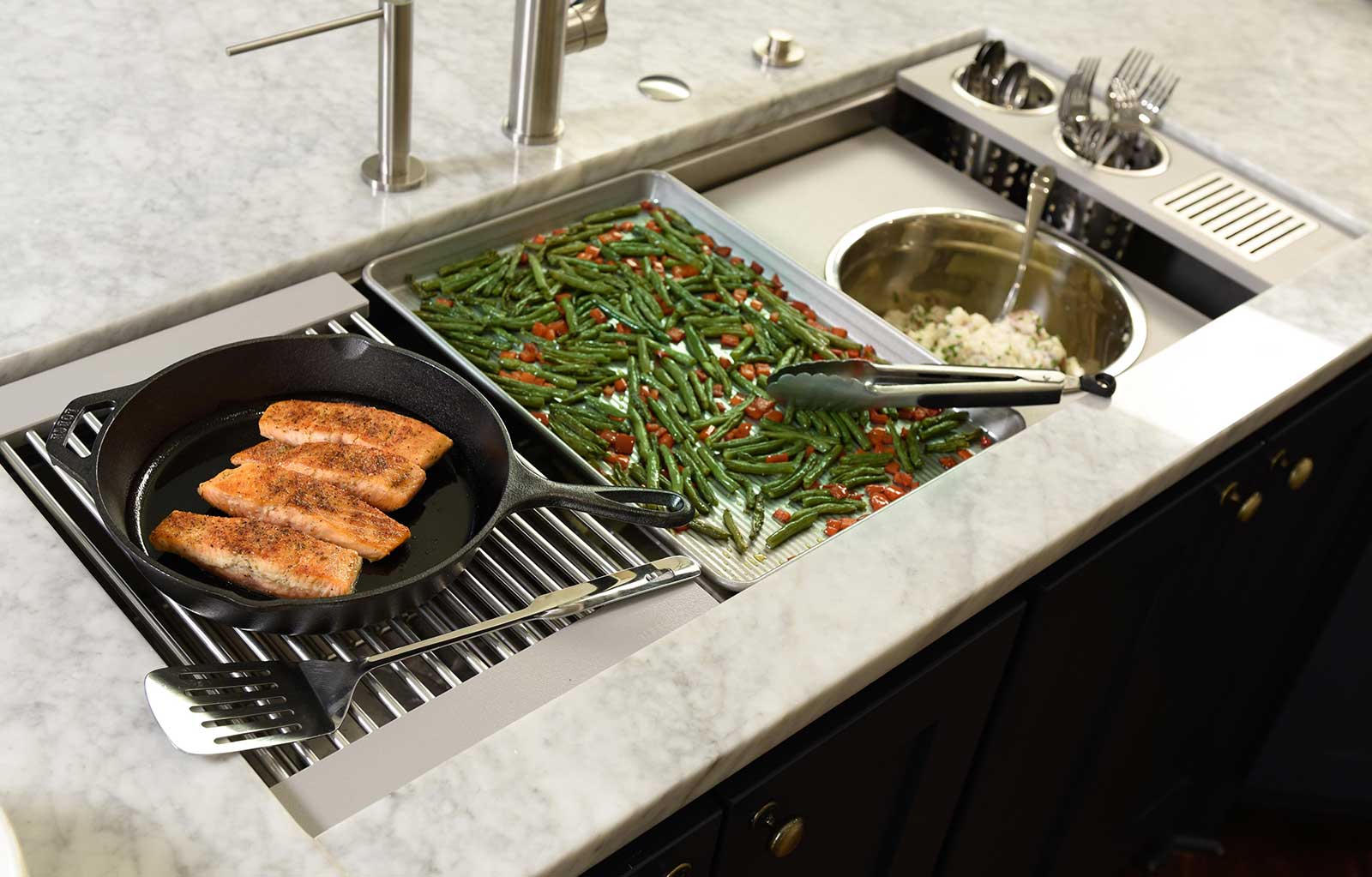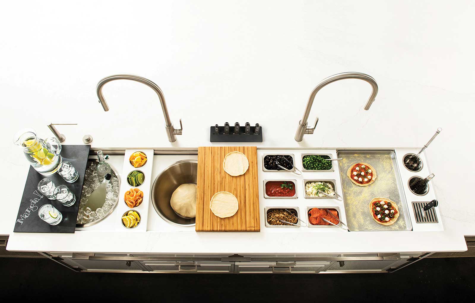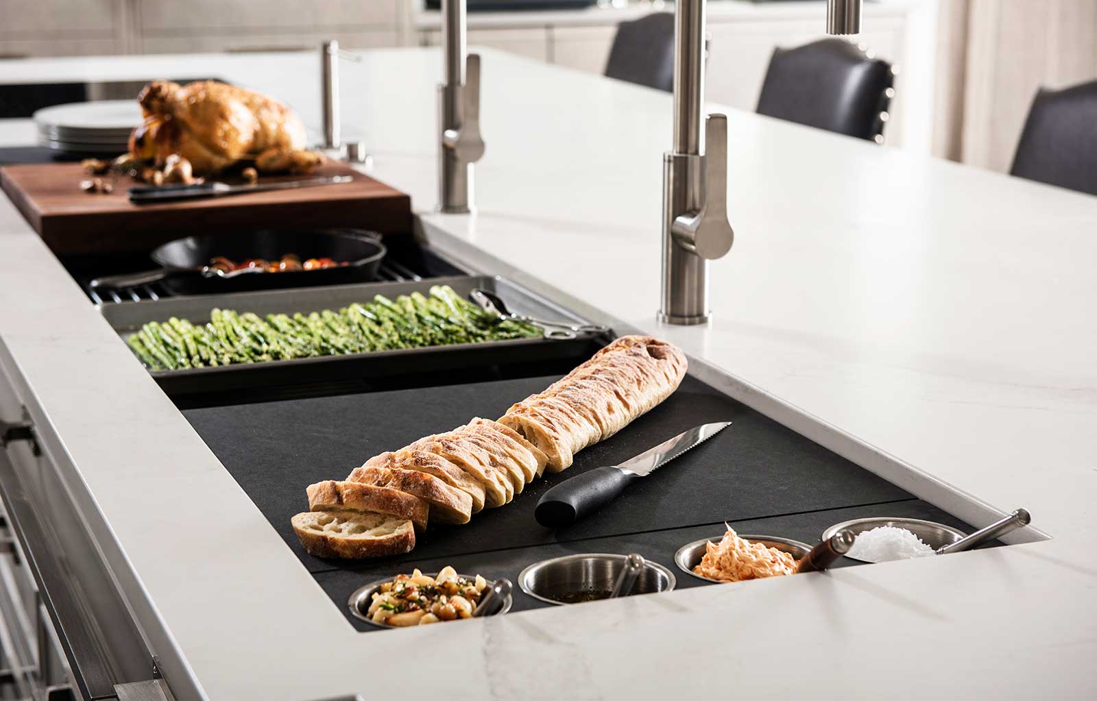 In your Galley, you can chop, strain, and mix easily and ergonomically to prepare a meal and efficiently transition to cooking with a cooktop nearby. Using various Serving Boards, quickly and conveniently transform your prepare and cook station into a serving station or set out drinks and hors d’oeuvres to create an ideal entertain station. Contain the mess within your Galley and clean throughout preparing, cooking, serving, and entertaining!