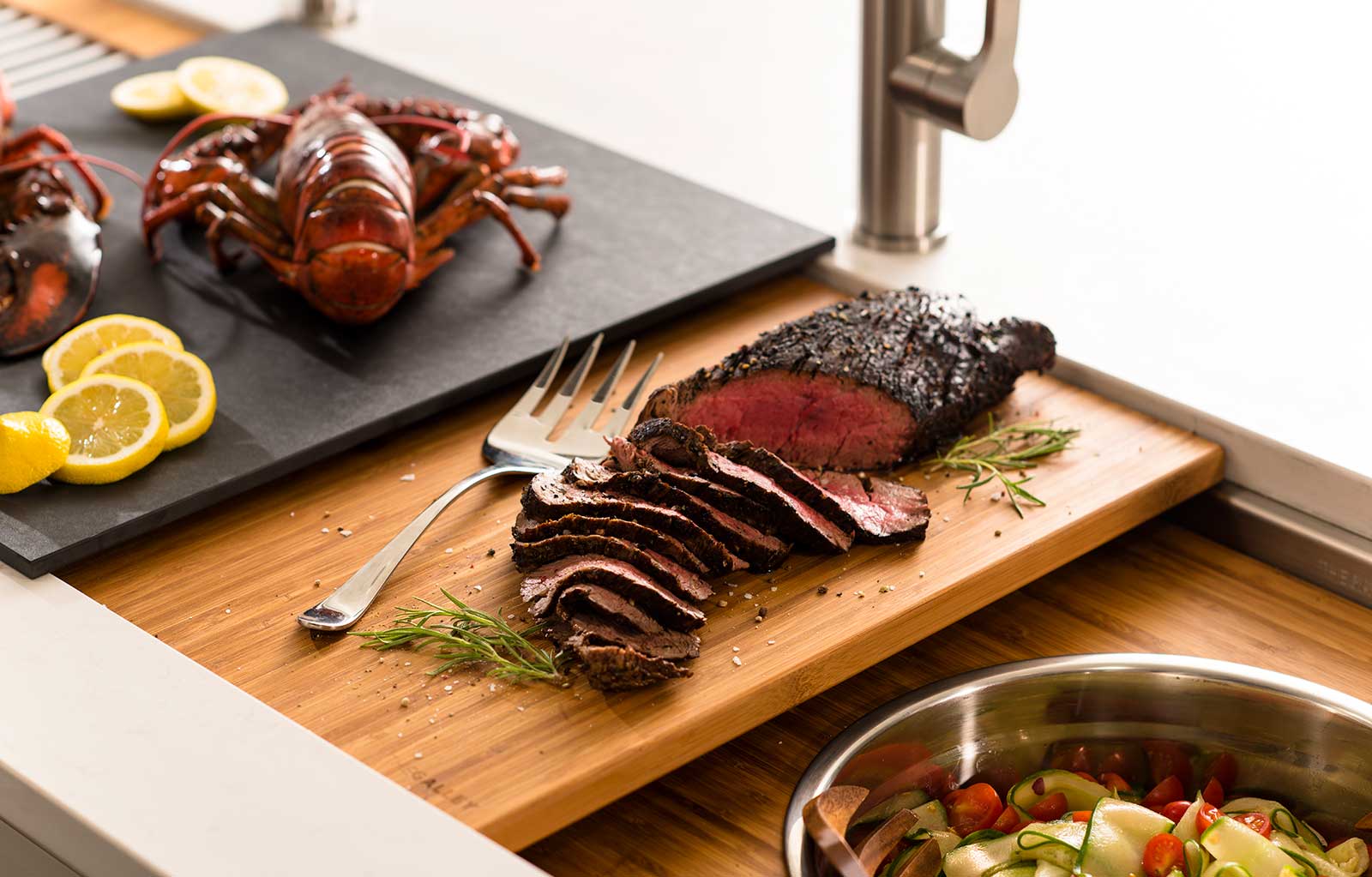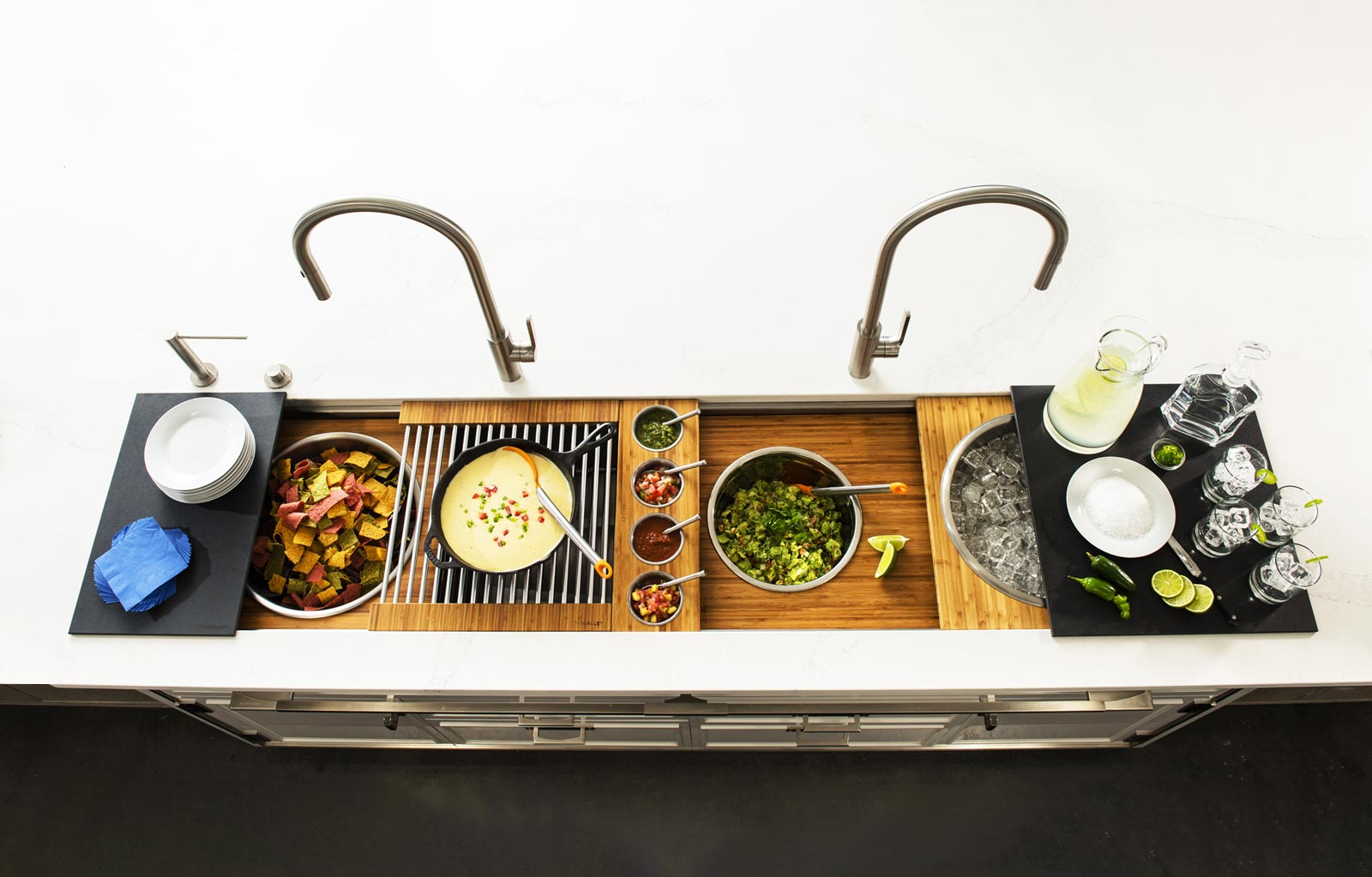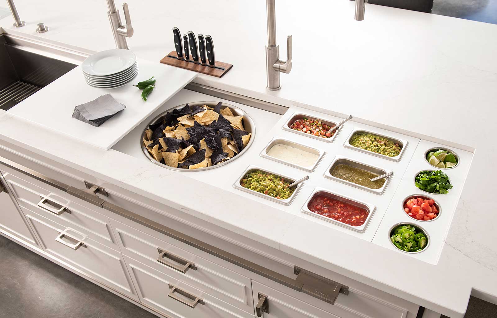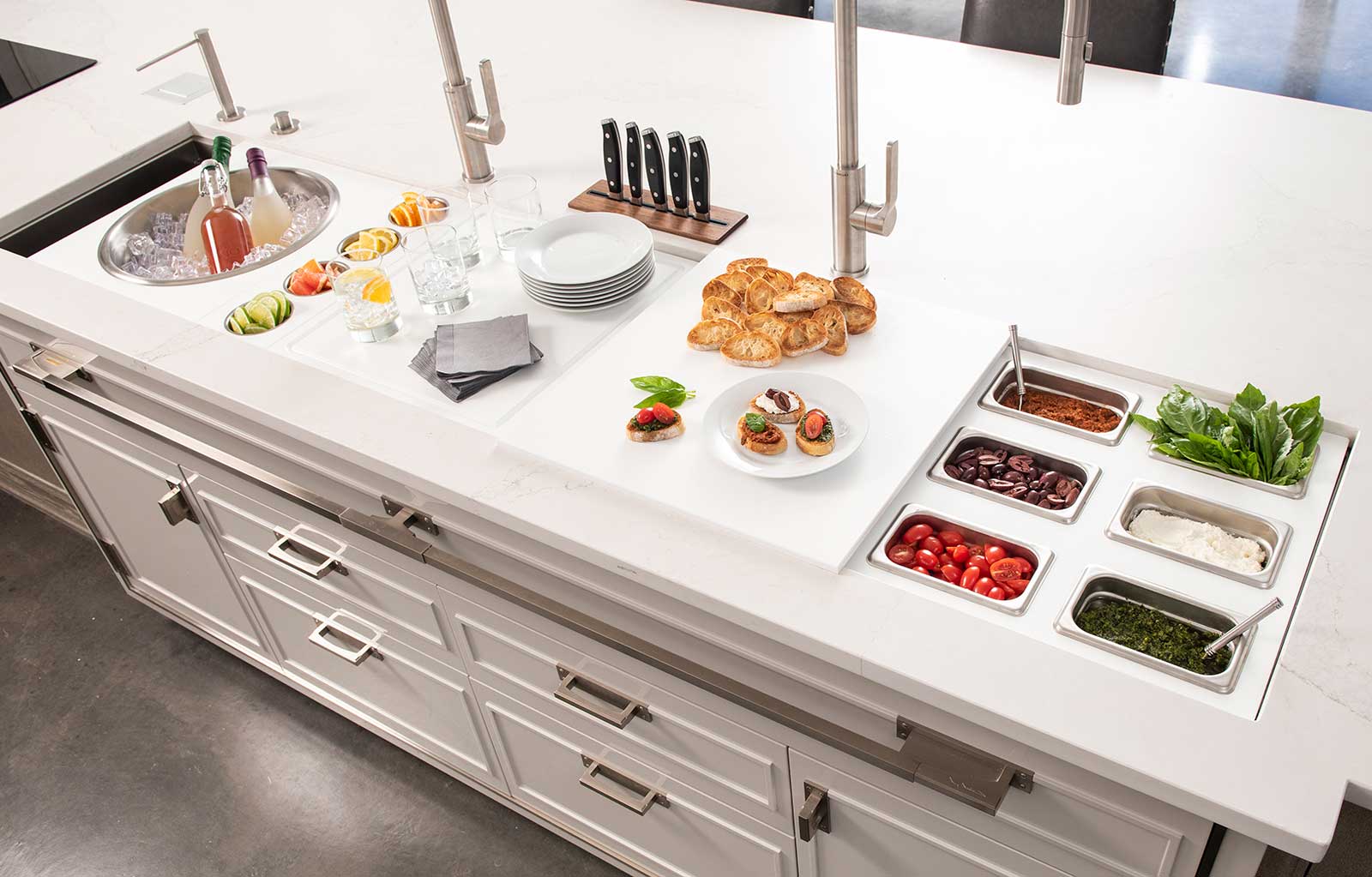 In your Galley, you can chop, strain, and mix easily and ergonomically to prepare a meal and efficiently transition to cooking with a cooktop nearby. Using various Serving Boards, quickly and conveniently transform your prepare and cook station into a serving station or set out drinks and hors d’oeuvres to create an ideal entertain station. Contain the mess within your Galley and clean throughout preparing, cooking, serving, and entertaining!